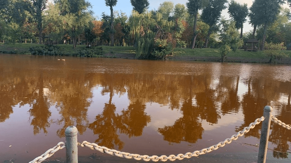 Такой цвет воды был вызван из-за восстановительных работ. Во время них соответствующие службы использовали такие материалы как: